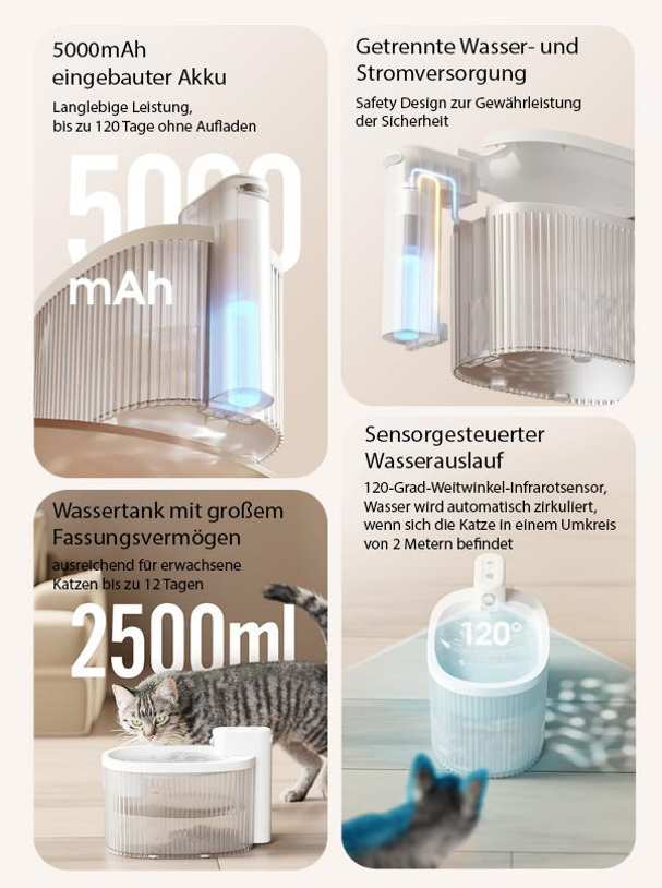 ● Verbesserte Wasserzufuhr: Katzen neigen von Natur aus dazu, weniger zu trinken. Das stetige Fließen und Plätschern des Wassers im Katzen-Trinkbrunnen regt zum Trinken an.